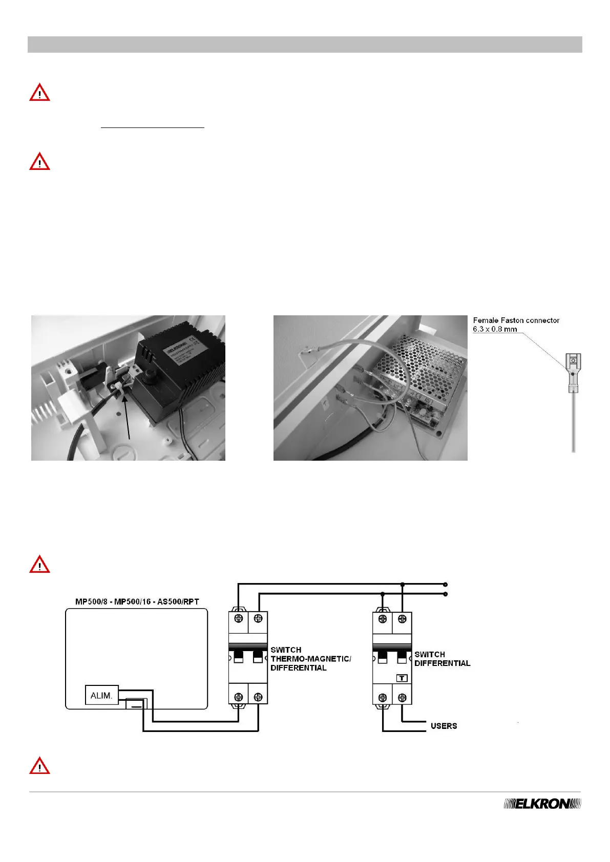 The MP500/16 control panel and the AS500/RPT power supply require, instead, an each connection (PE) made with cable of a section