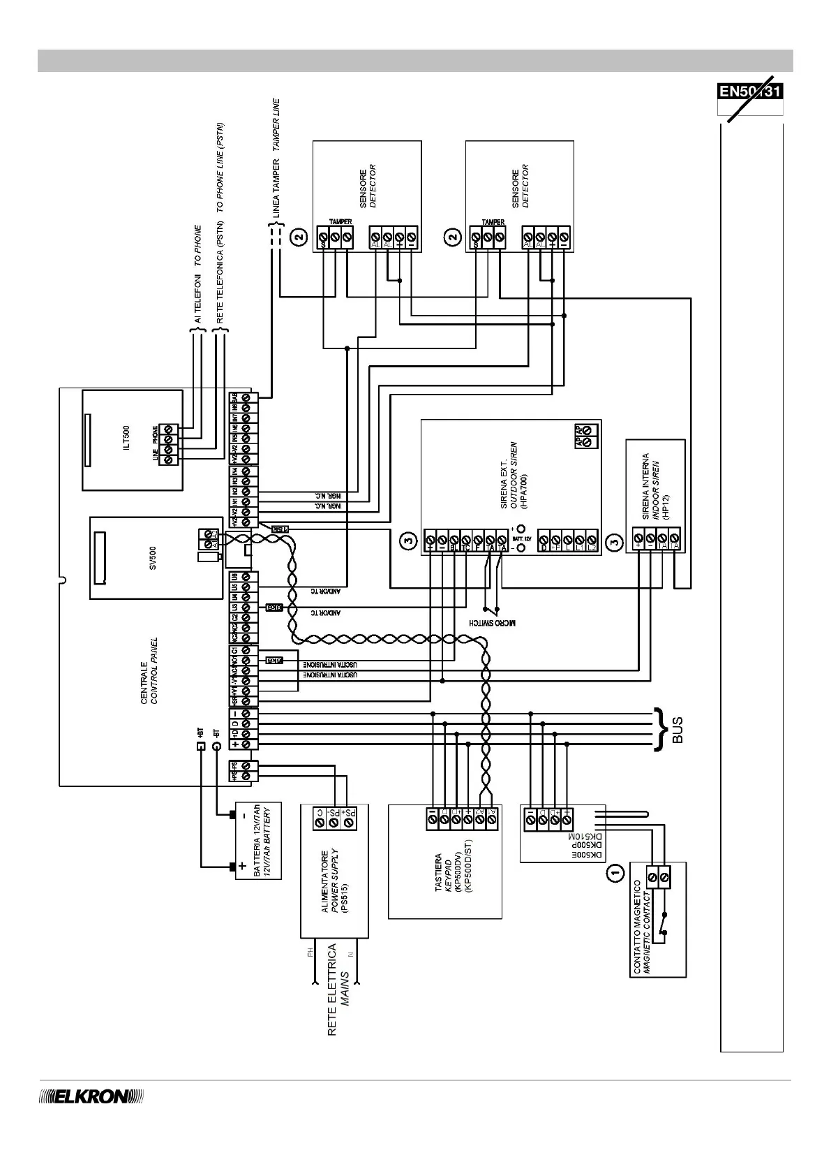 Elkron MP500/8 - Example of Diagram with NC Inputs MP500;8-MP500;16