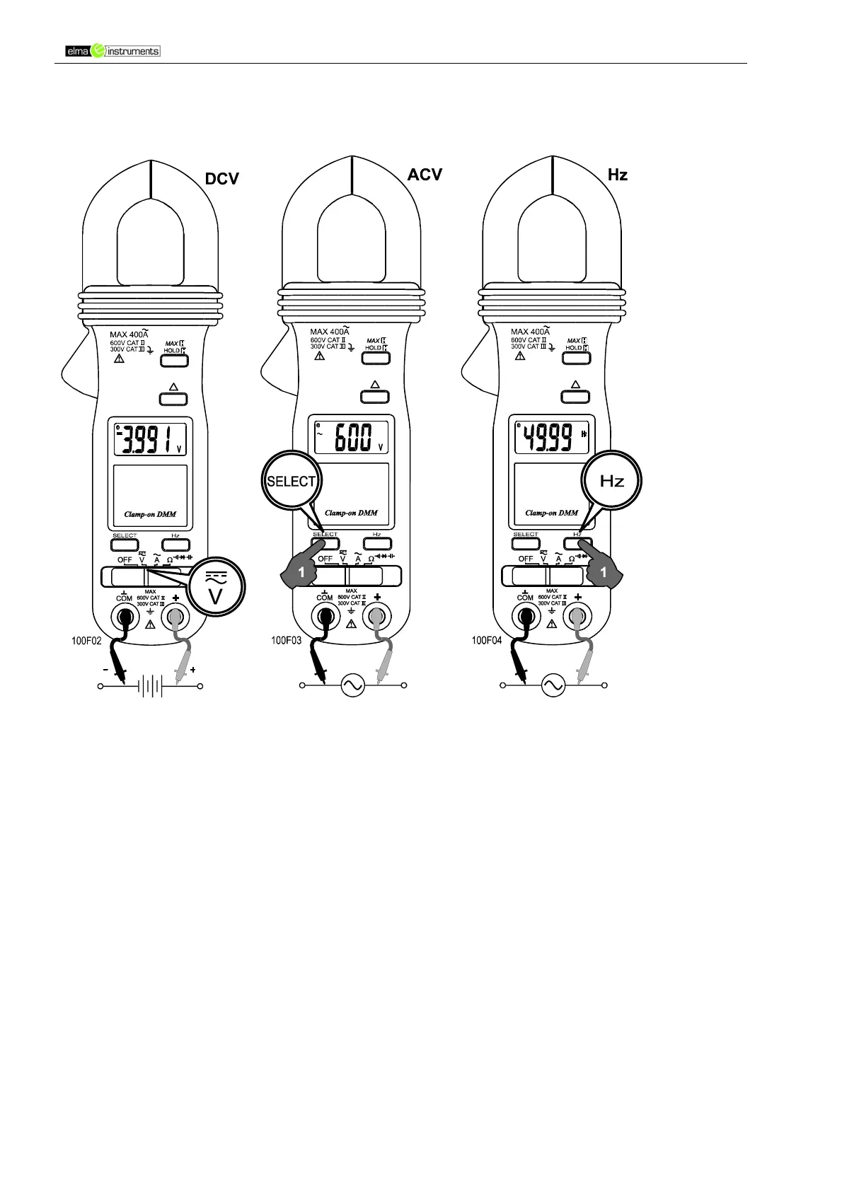 Anslut testledningarna till instrumentet. Funktionsväljaren sätts i V-position. Tryck på SELECT