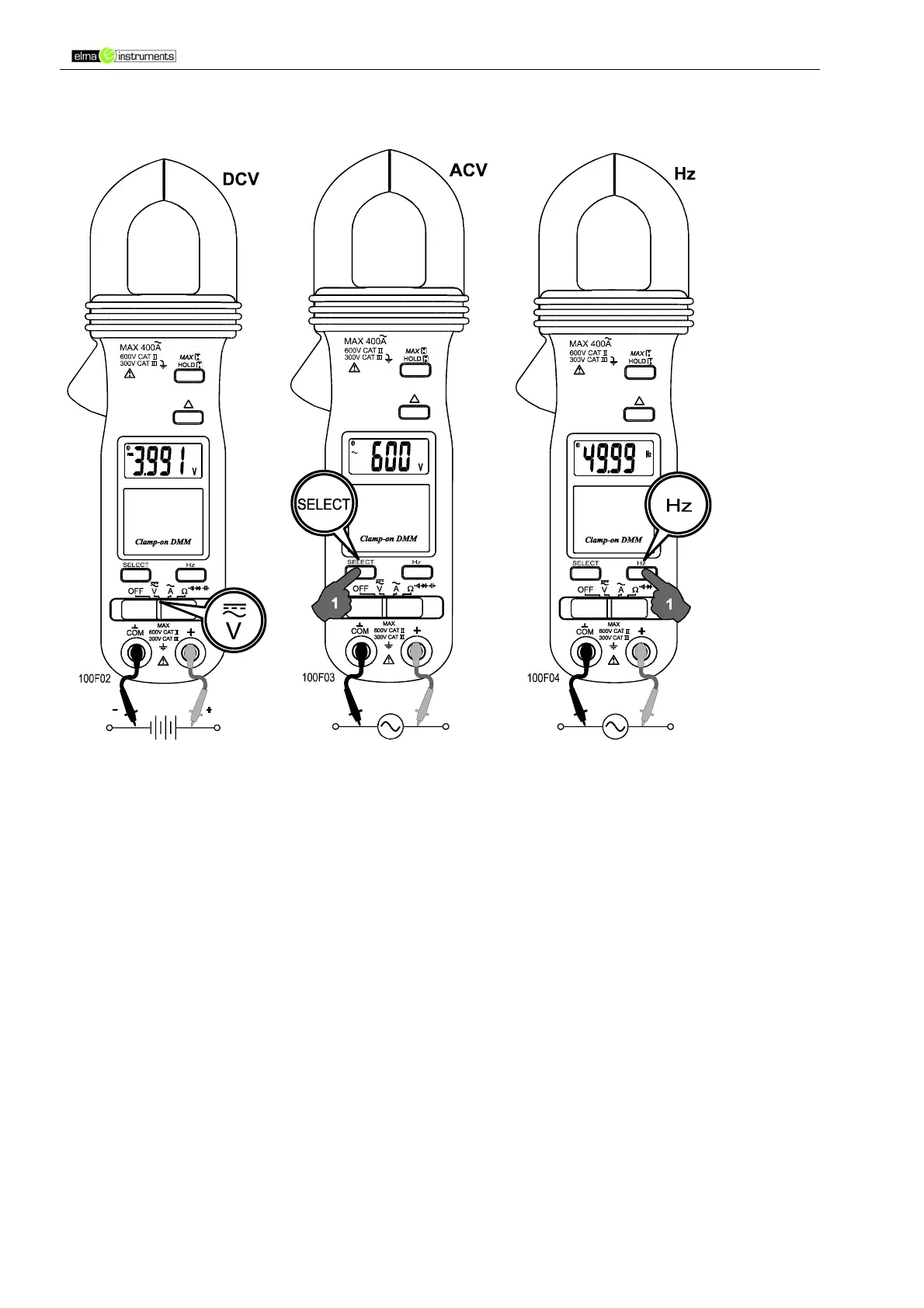 Elma 3036 & 3038: DCV og ACV via testledningerne; AC A via strømtangen