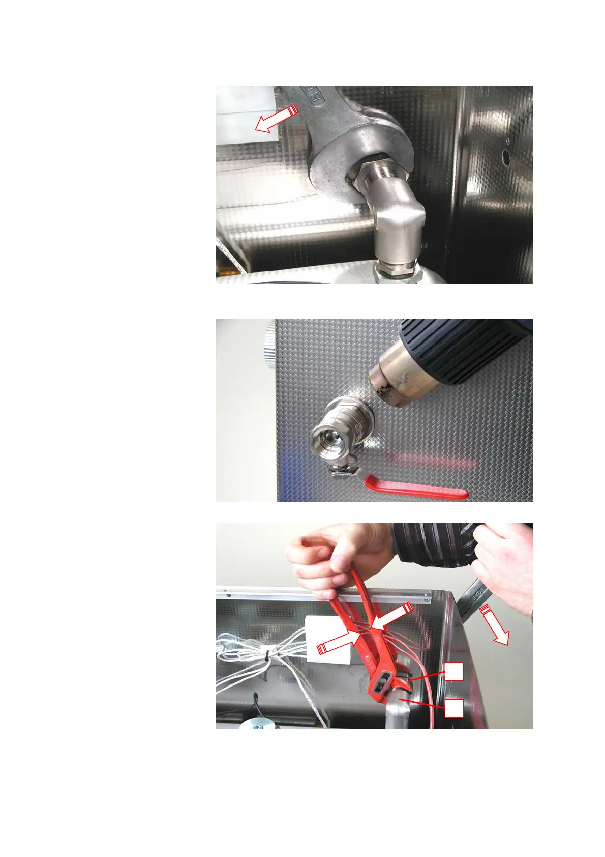 Illustration 12.1.6. Secure the duct nipple (A) with a pipe wrench to