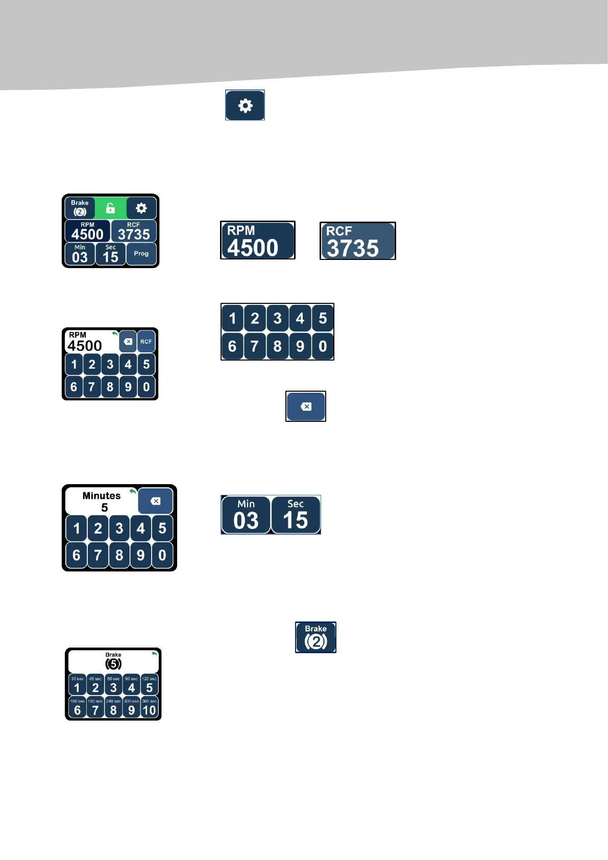 (RPM or RCF) in the upper part of the touchscreen (on a white background).