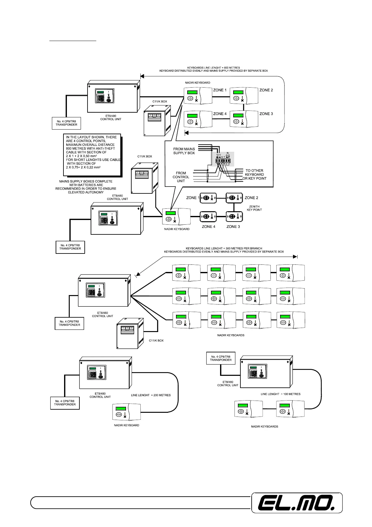 Main connections of a system divided up into four zones with the keyboard of the ET8/480 control unit used as supervi-