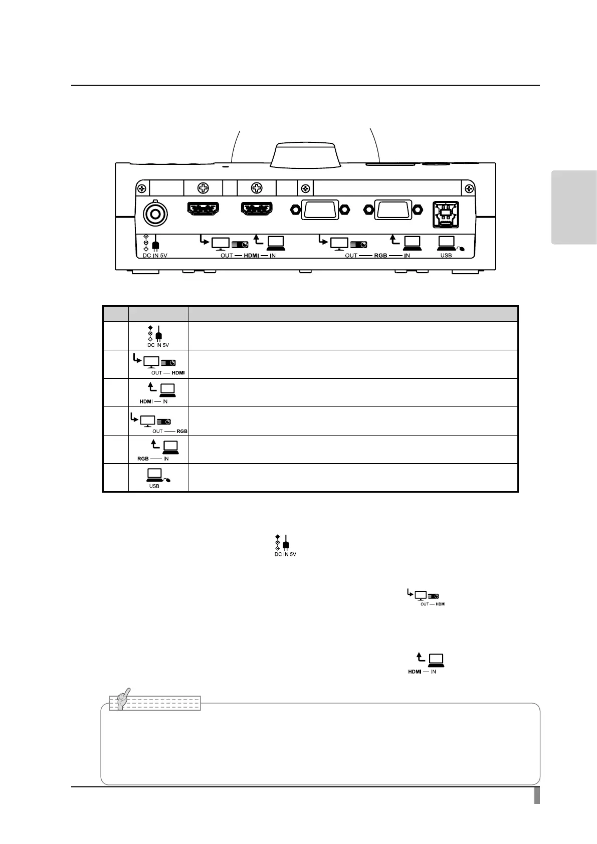 Connect a commercially available HDMI cable to the [ ] port on the rear