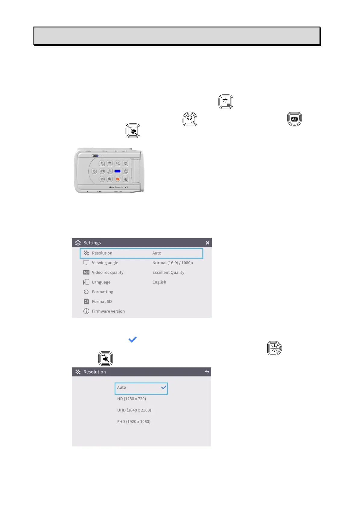 (The resolution setting can also be changed by pressing the Brightness – button [ ] and the