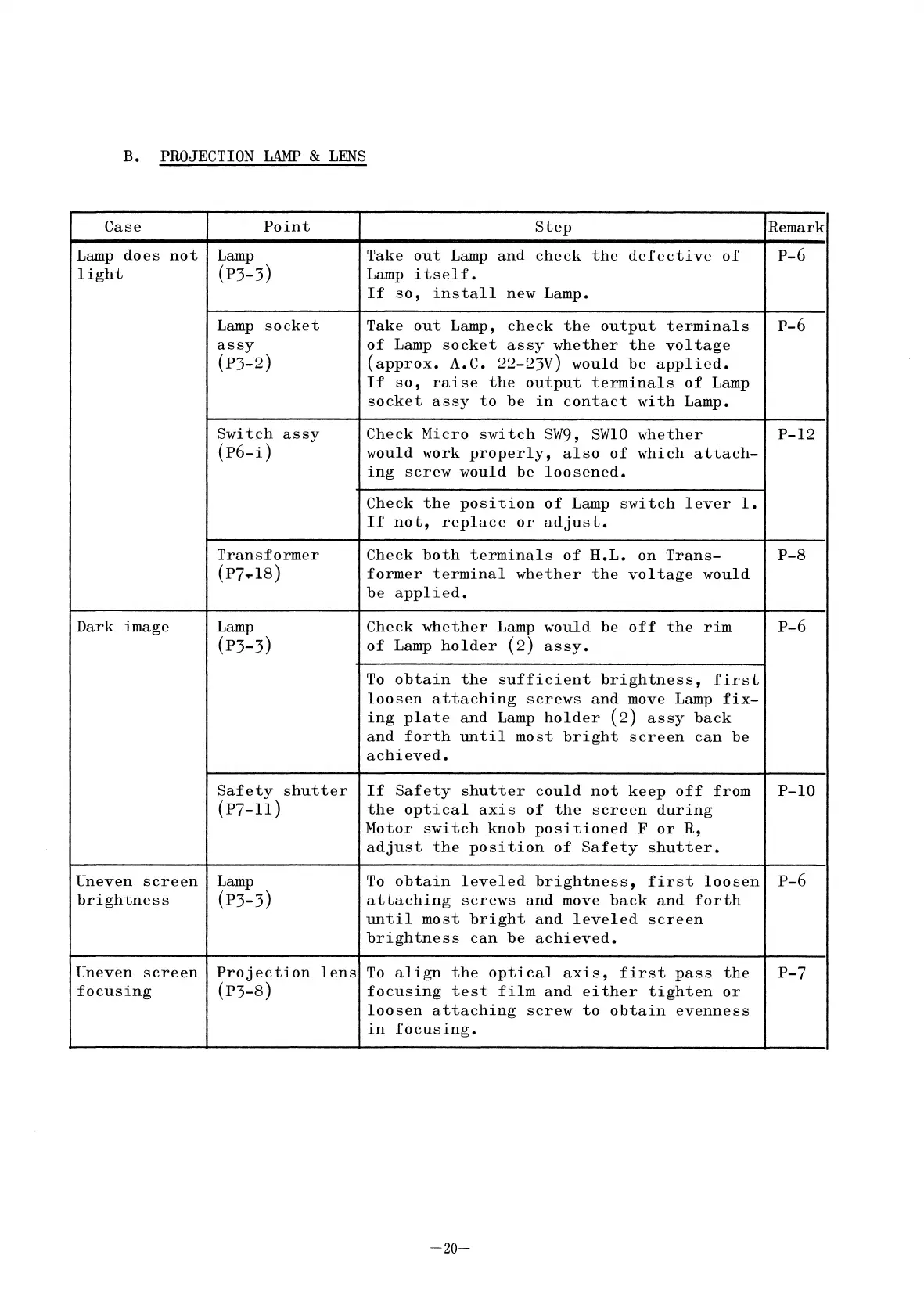 Elmo ST-1200 - B. PROJECTION LAMP & LENS; Lamp does not light; Dark image; Uneven screen brightness