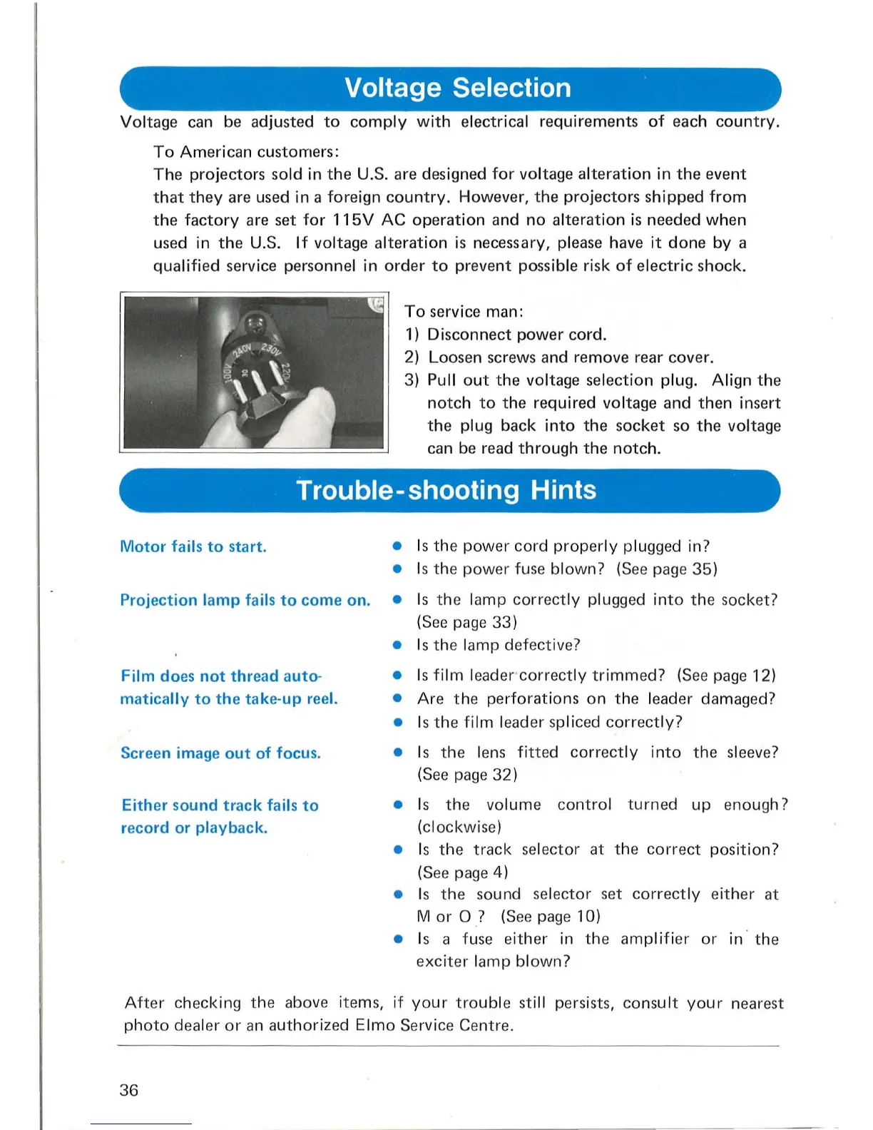 Elmo ST-600D - Voltage Selection; Trouble-Shooting Hints