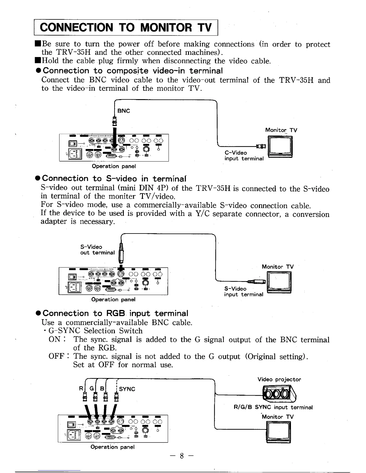 Elmo TRV-35H - Connection to Monitor TV; Connection to Composite Video-In Terminal; Connection to S-Video in Terminal; Connection to RGB Input Terminal
