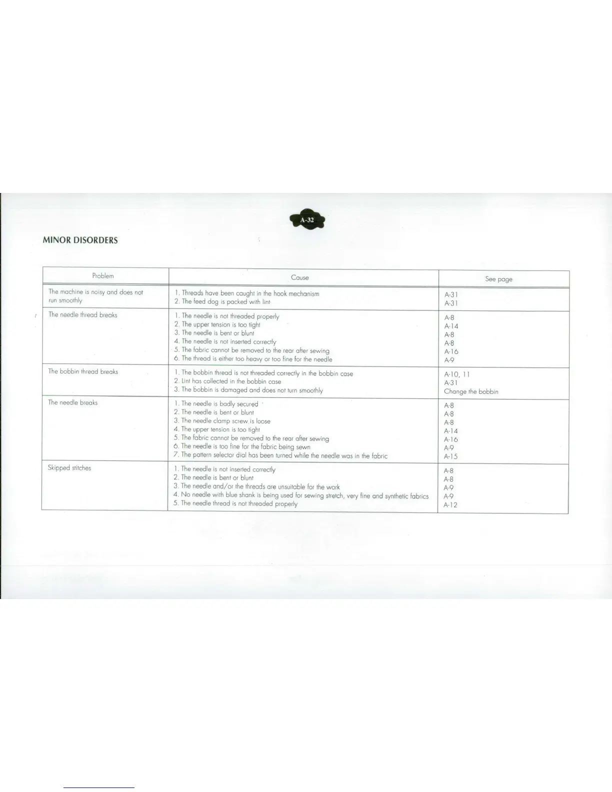 ELNA 3005 - Troubleshooting Minor Disorders; Machine Noise and Smoothness Issues; Needle Thread Breakage; Bobbin Thread Breakage