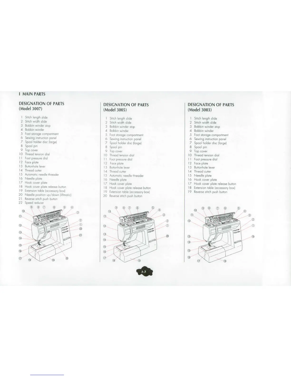 ELNA 3005 - Main Parts Identification; Designation of Parts (Model 3007); Designation of Parts (Model 3005); Designation of Parts (Model 3003)