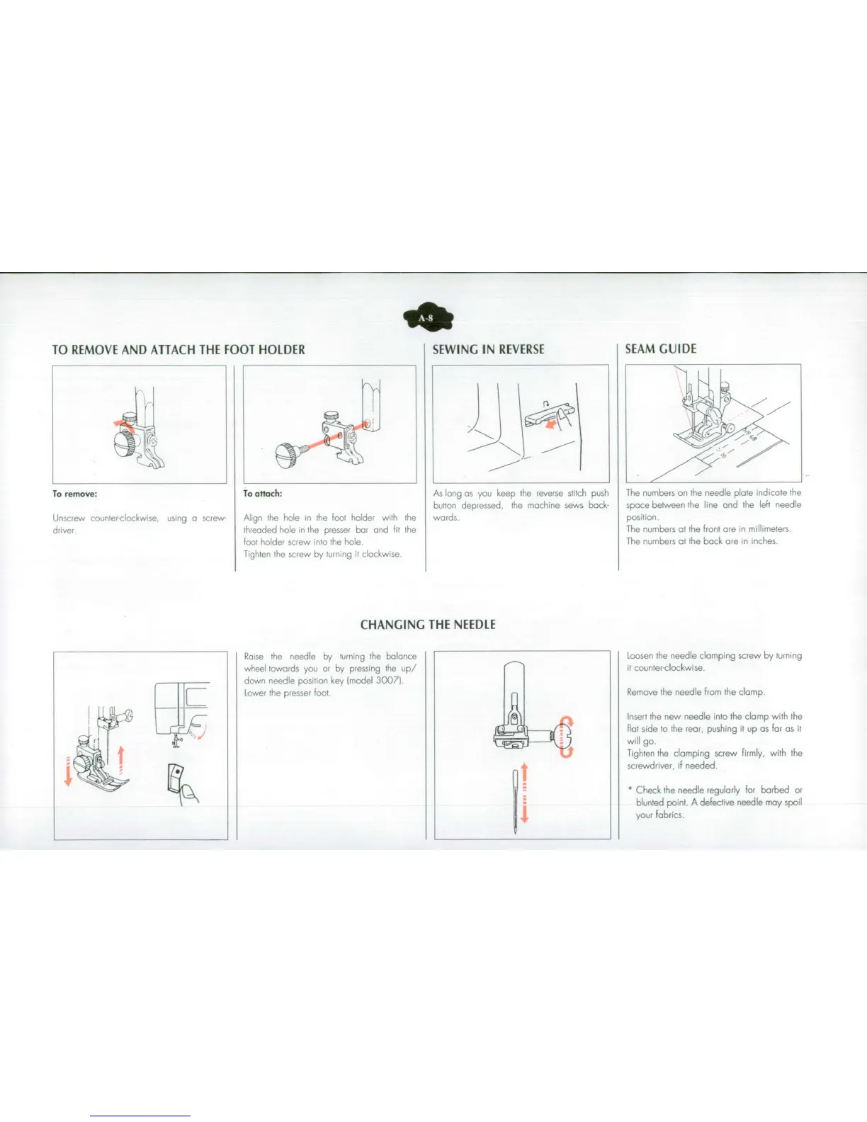 ELNA 3005 - Needle and Threading Procedures; Foot Holder Attachment;Removal; Sewing in Reverse; Seam Guide Usage