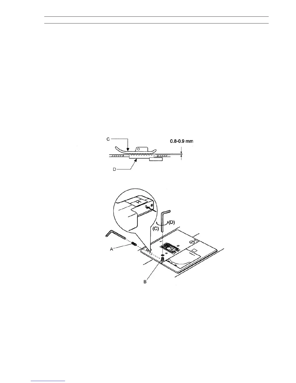 6. If the feed dog height is higher than 0.9 mm: Turn the adjusting screw B in the direction of D.