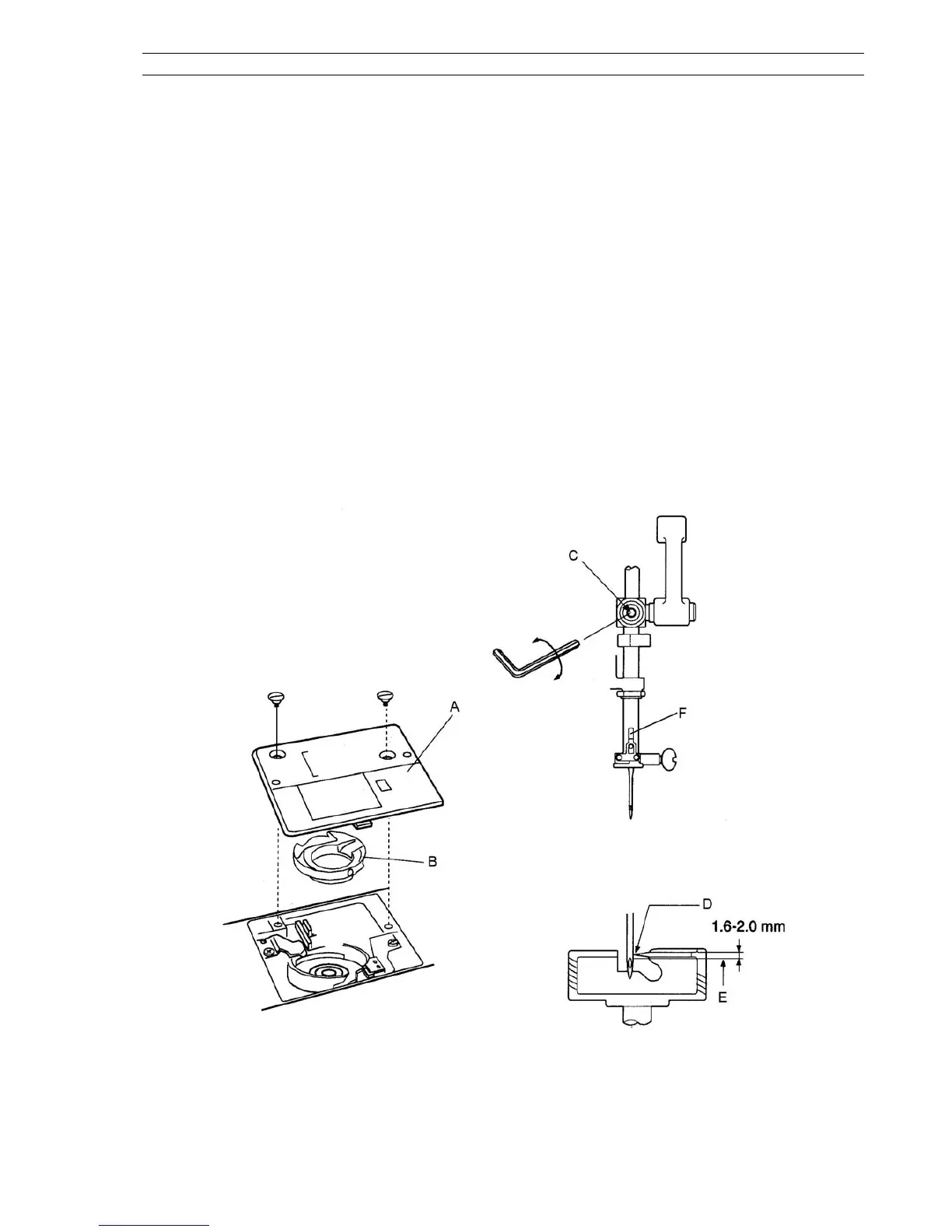 3. Turn the handwheel until the tip of the hook D meets with the right side of the needle.