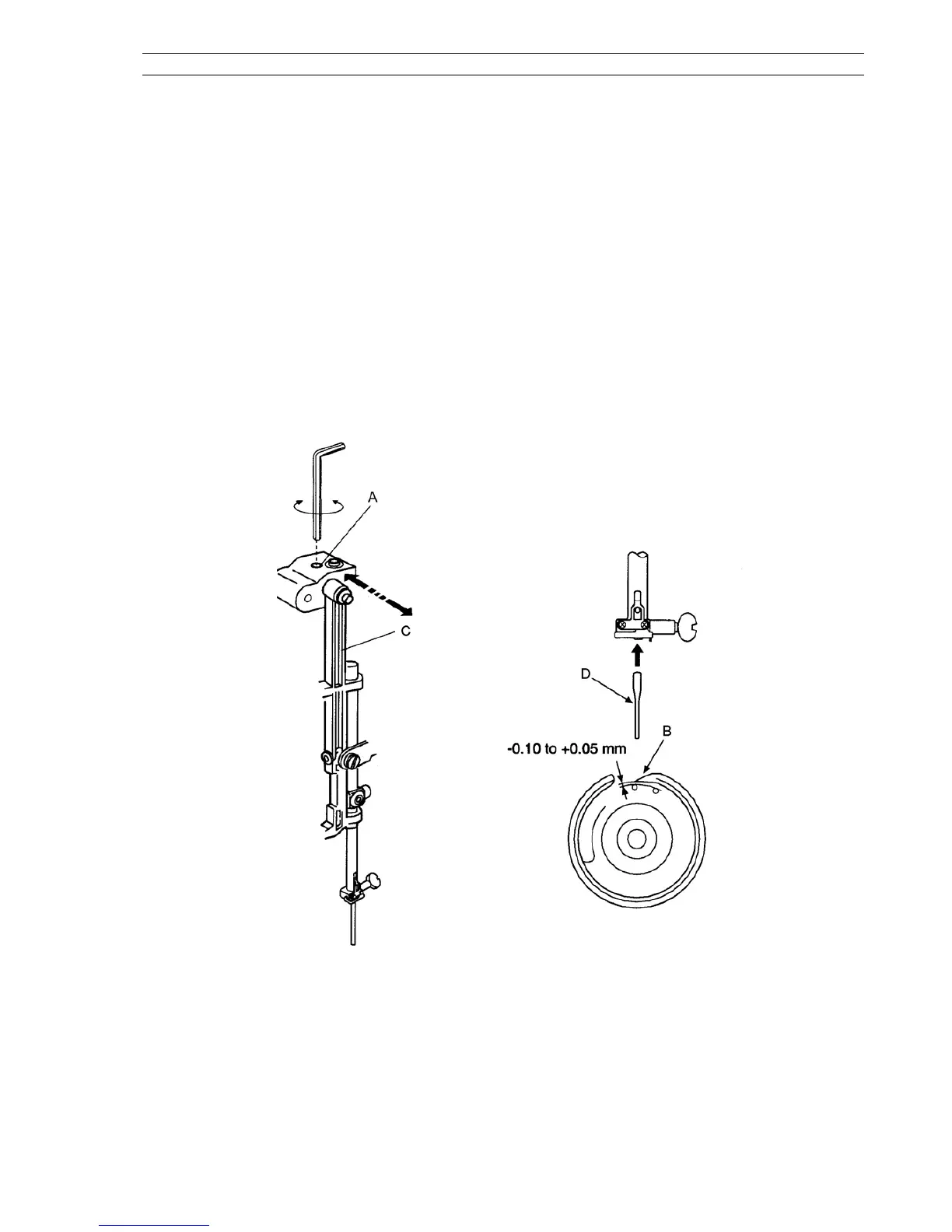 The clearance between the needle and hook should be -0.10 to +0.05 mm.