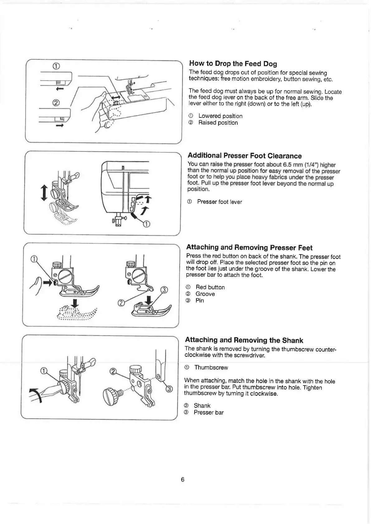 ELNA 6003 - How to Drop the Feed Dog; Additional Presser Foot Clearance; Attaching and Removing Presser Feet; Attaching and Removing the Shank
