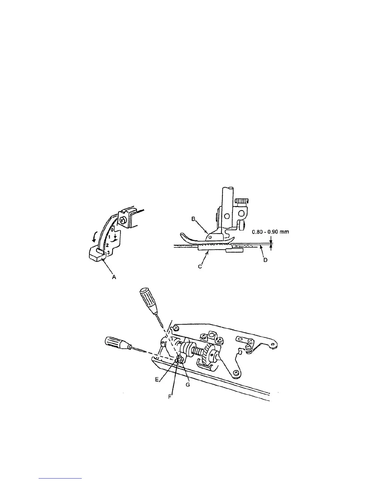 6. Adjust the feed dog height to 0.80 mm to 0.90 mm by tuming adjusting screw F.