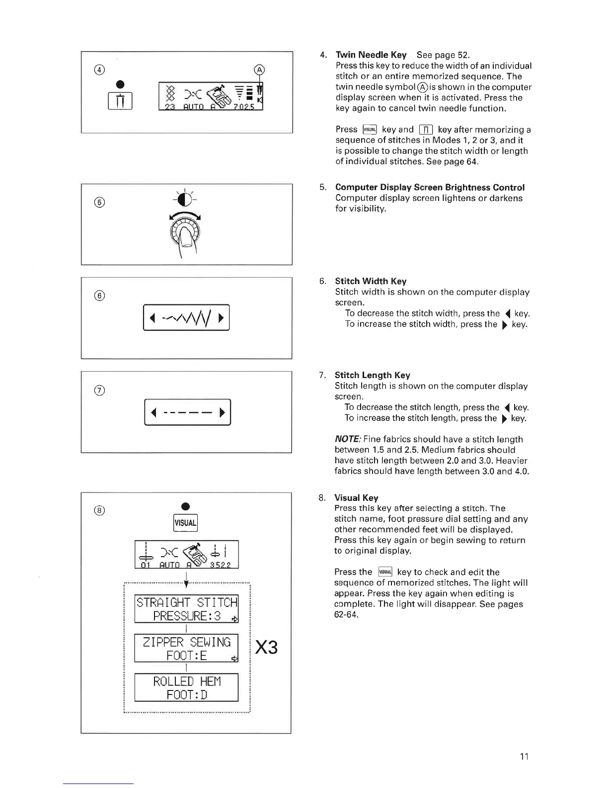 ELNA 6005 - Twin Needle Key; Computer Display Screen Brightness Control; Stitch Width Key, Stitch Length Key; Visual Key