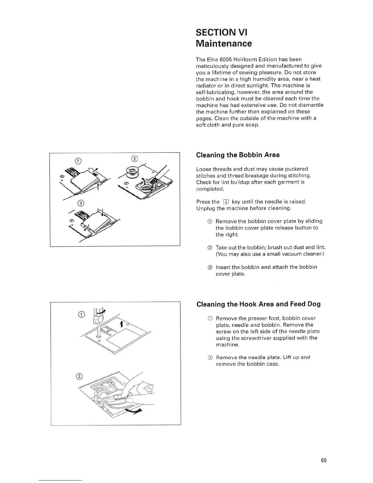 ELNA 6005 - Cleaning the Bobbin Area; Cleaning the Hook Area and Feed Dog