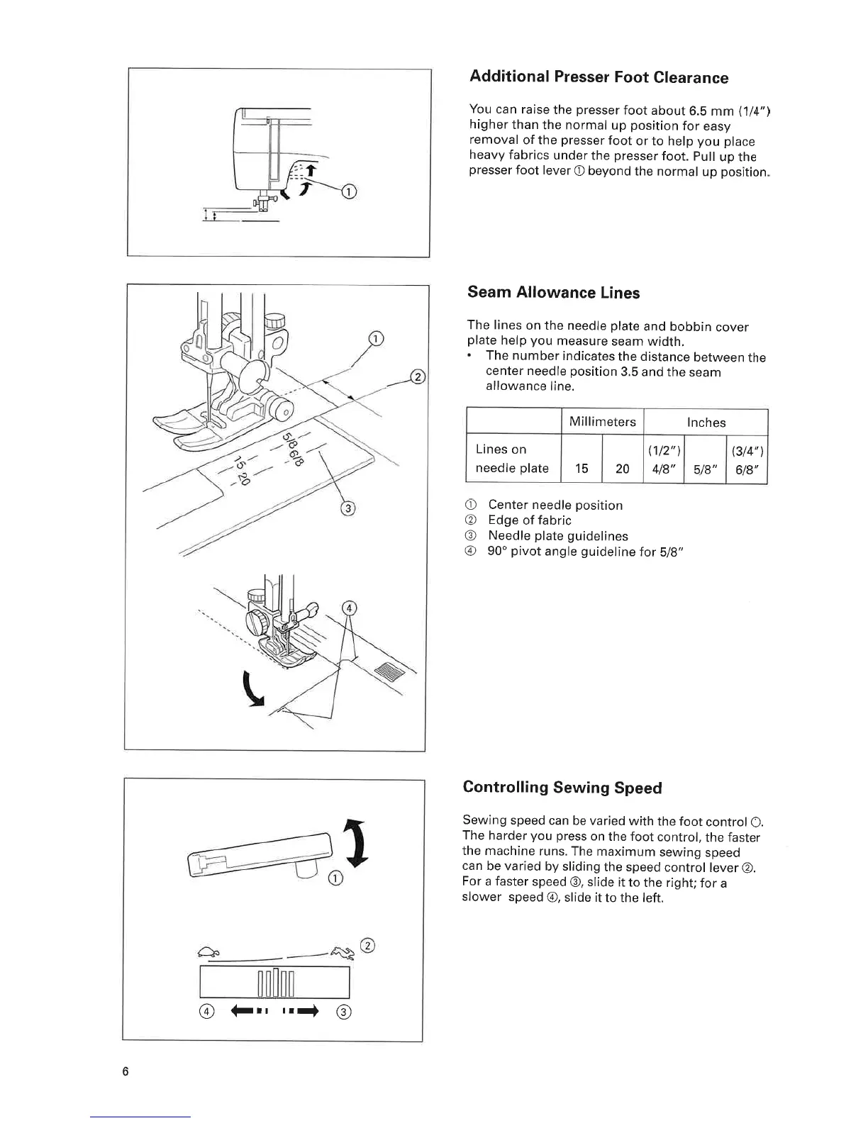ELNA 6005 - Additional Presser Foot Clearance; Seam Allowance Lines; Controlling Sewing Speed