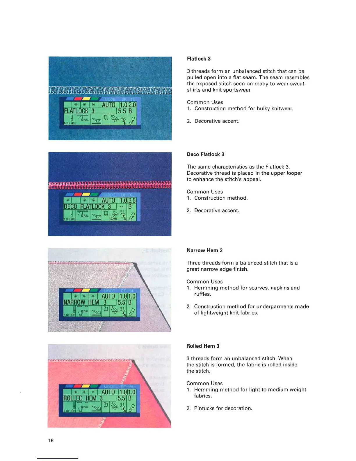 ELNA 945 - Flatlock 3 Stitch; Deco Flatlock 3 Stitch; Narrow Hem 3 Stitch; Rolled Hem 3 Stitch