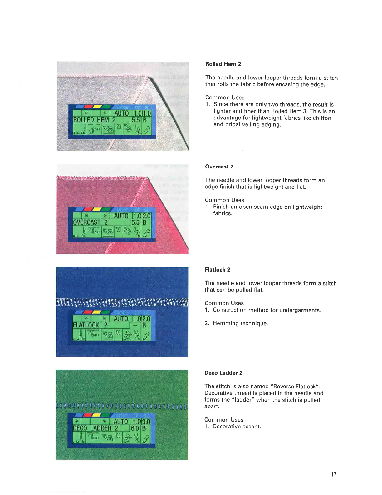ELNA 945 - Rolled Hem 2 Stitch; Overcast 2 Stitch; Flatlock 2 Stitch; Deco Ladder 2 Stitch