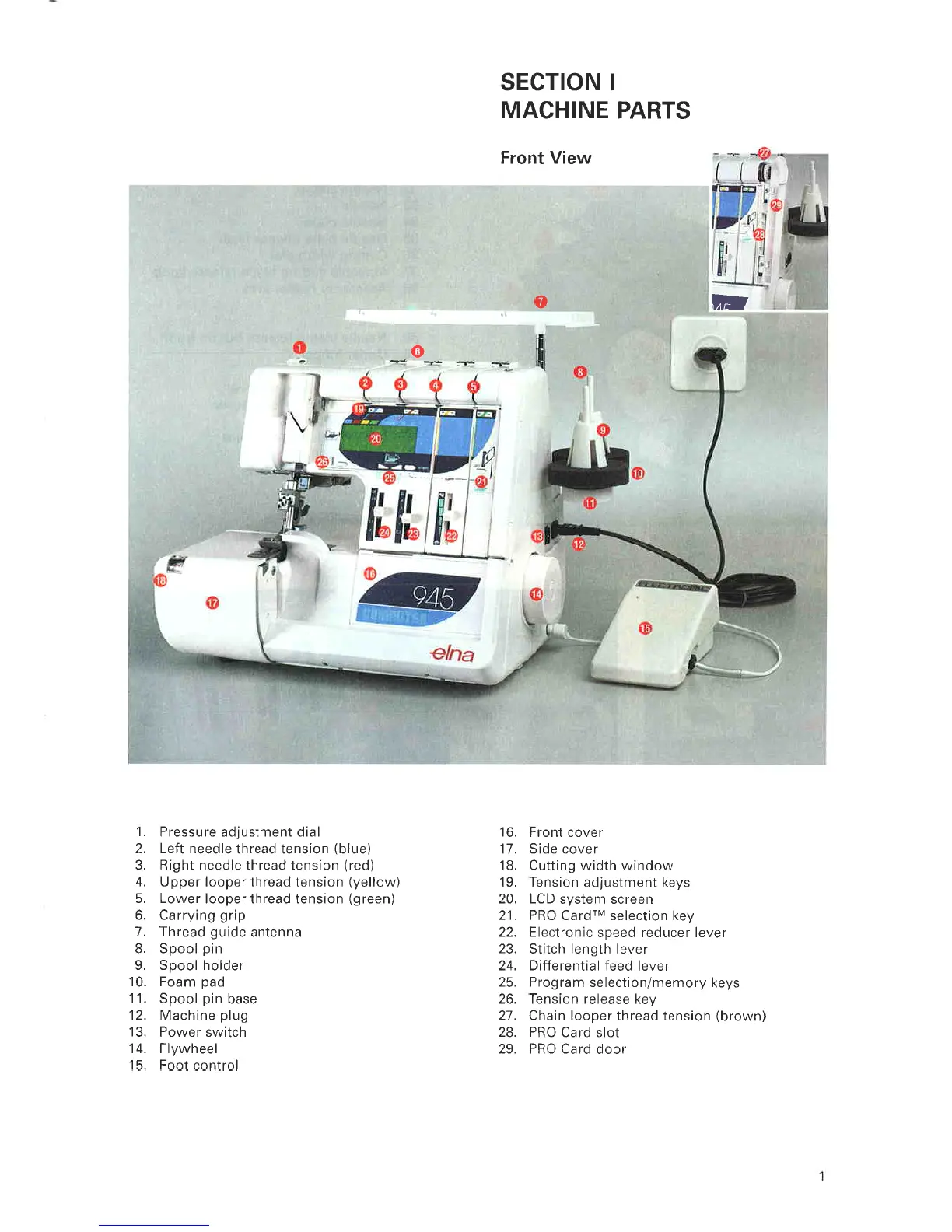 ELNA 945 - SECTION I MACHINE PARTS; Front View