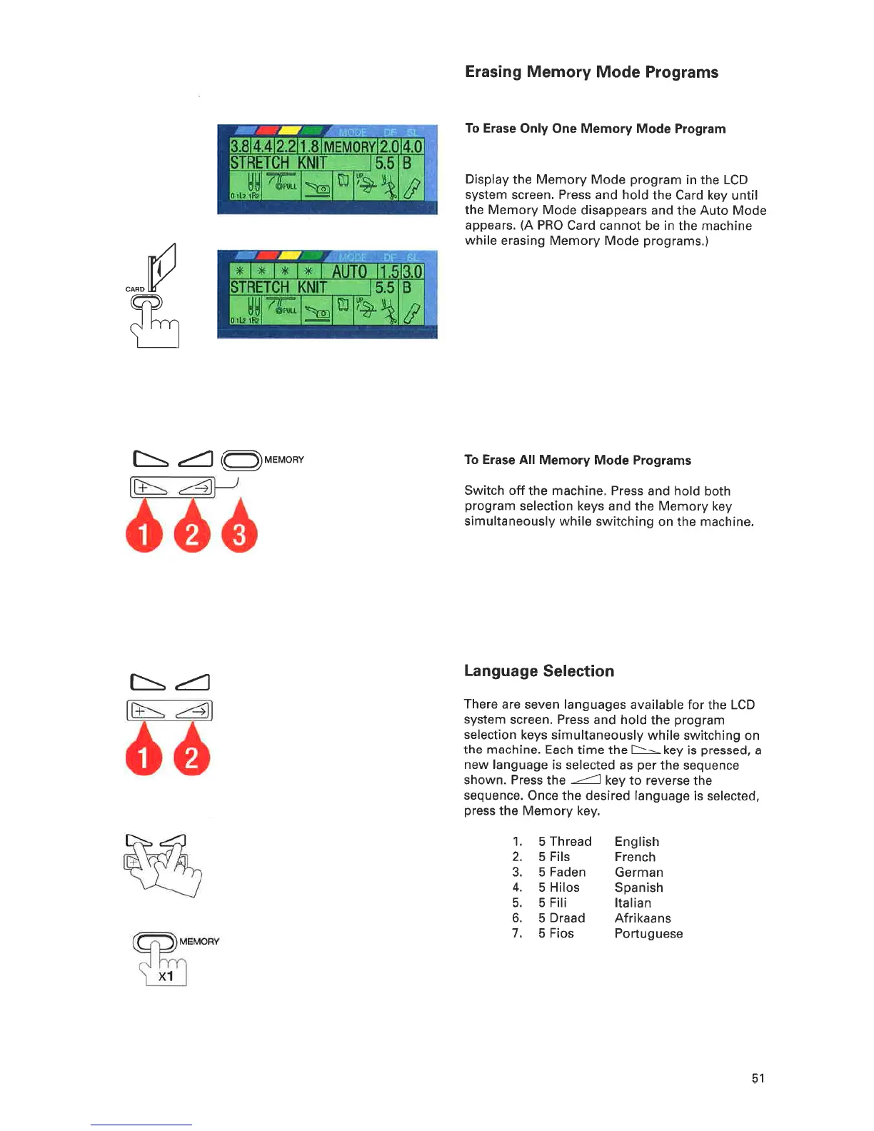 ELNA 945 - Memory Mode Programs Management; Erasing Memory Mode Programs; Language Selection for LCD Screen