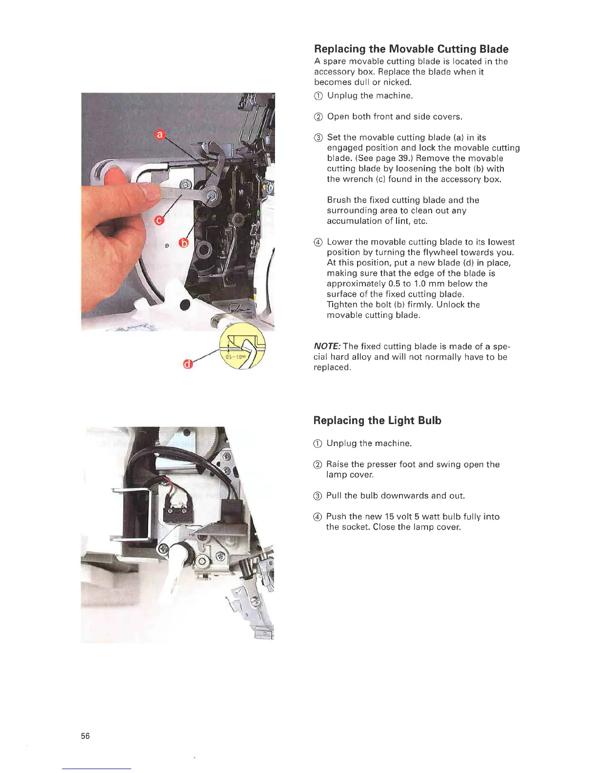 ELNA 945 - Replacing the Movable Cutting Blade; Replacing the Light Bulb