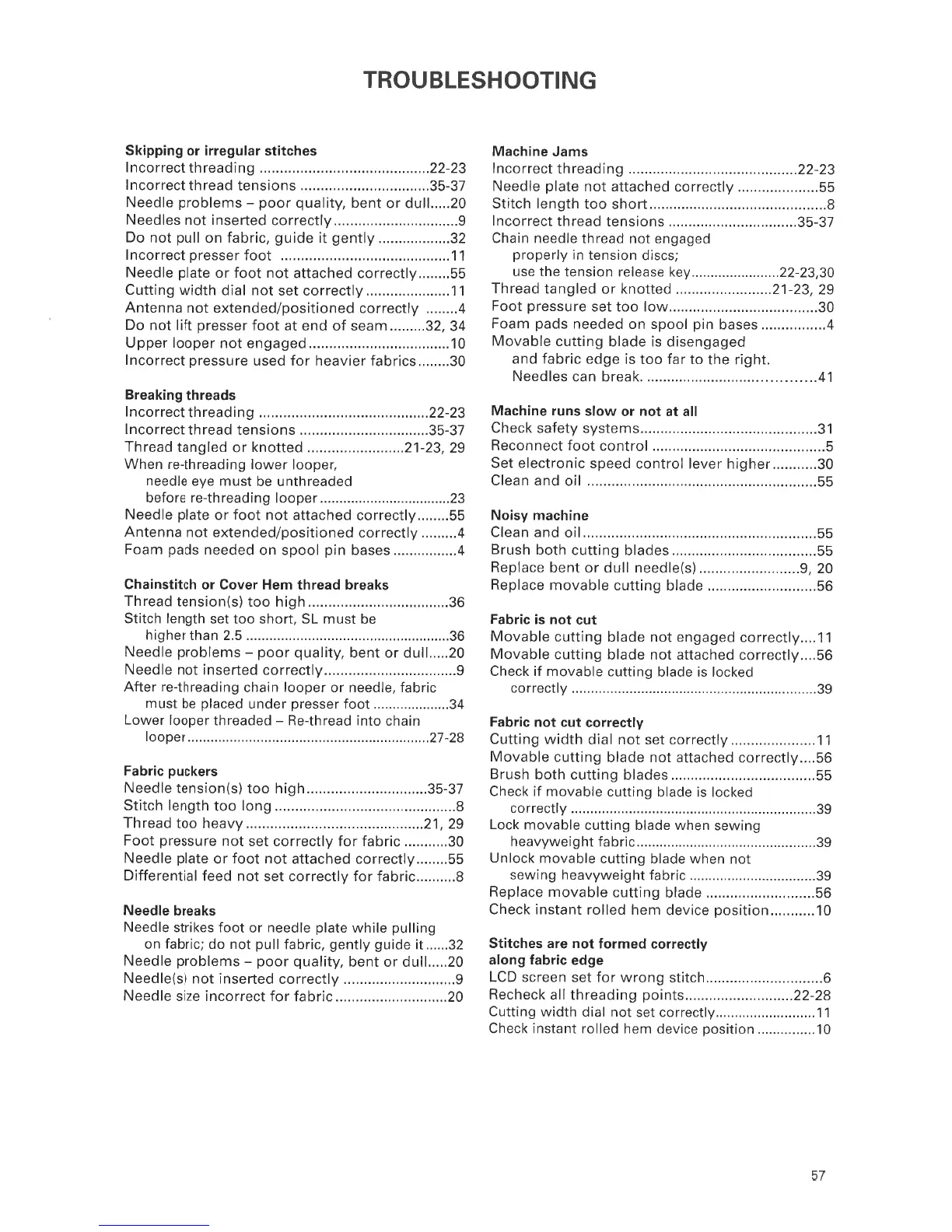 ELNA 945 - TROUBLESHOOTING; Skipping or Irregular Stitches; Machine Jams & Slow Operation; Breaking Threads