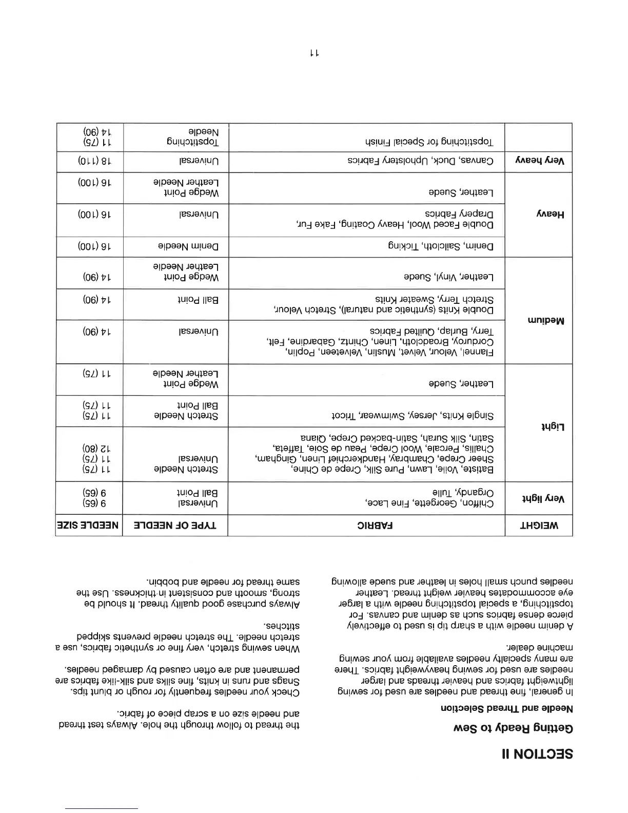 ELNA CE20 - SECTION II Getting Ready to Sew; Needle and Thread Selection