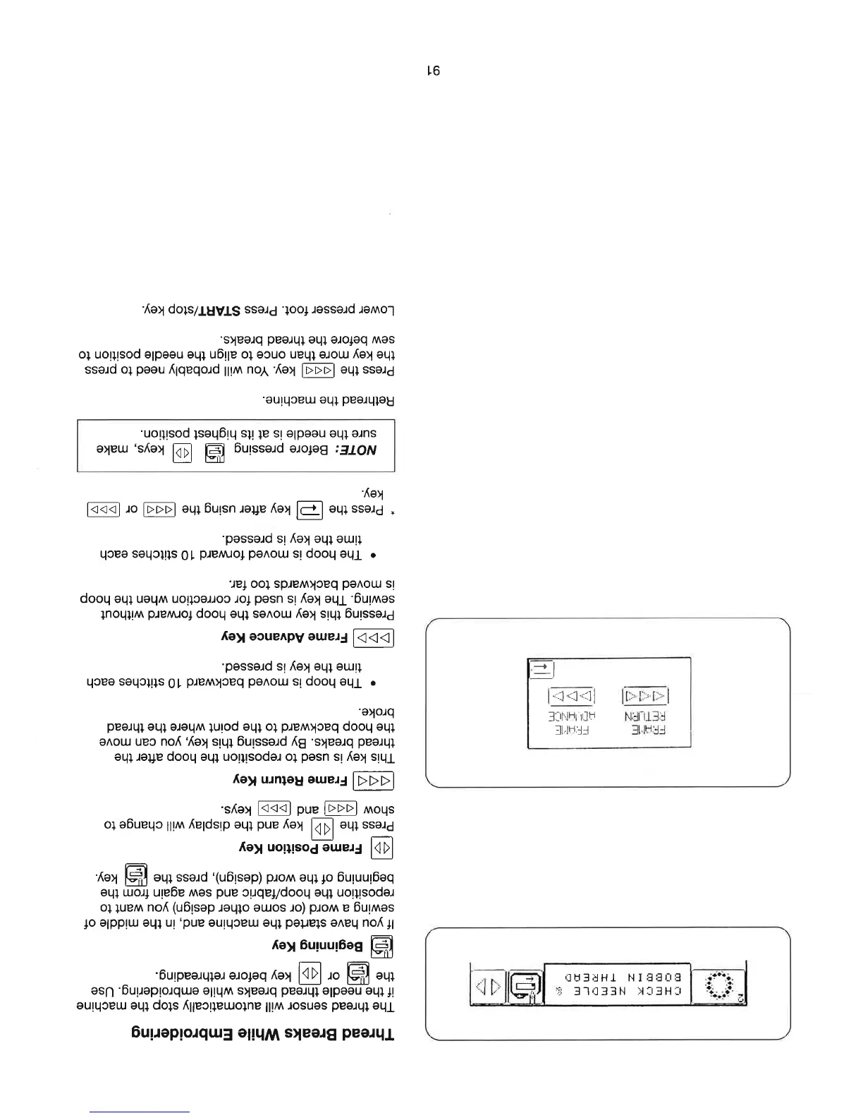 ELNA CE20 - Thread Breaks While Embroidering; Beginning Key; Frame Return Key; Frame Advance Key