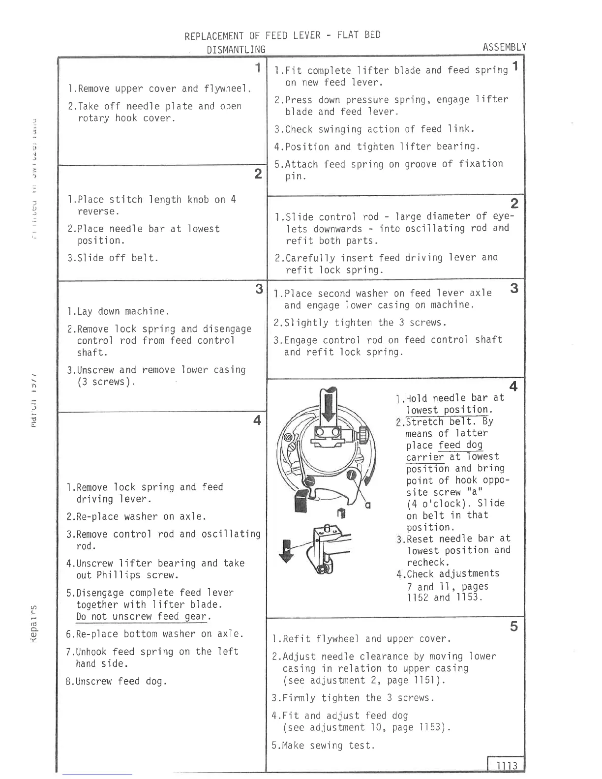 ELNA EC 11 - Feed Lever Replacement - Flat Bed; Dismantling Procedure; Assembly Procedure