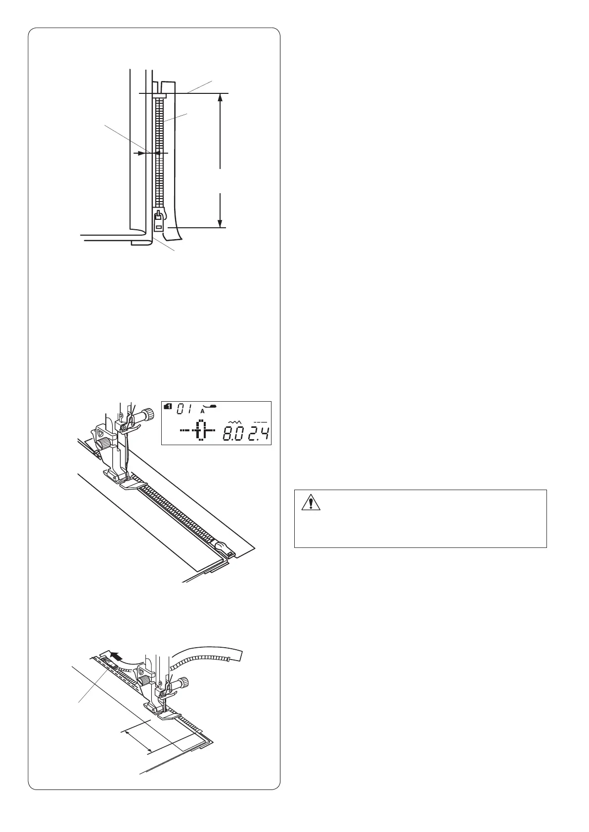 Stop 5 cm (2˝) before zipper foot E reaches the slider
