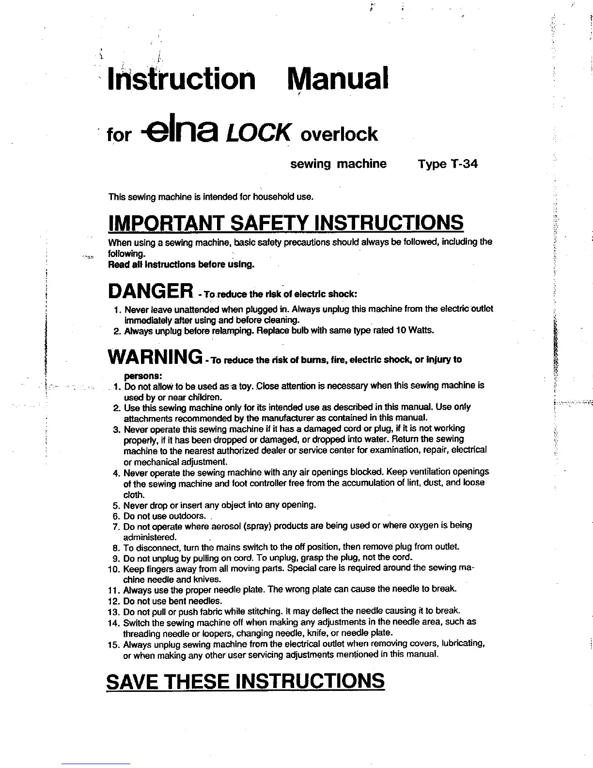ELNA T-34 - IMPORTANT SAFETY INSTRUCTIONS; Electrical Shock Safety (DANGER); User Safety Warnings (WARNING)