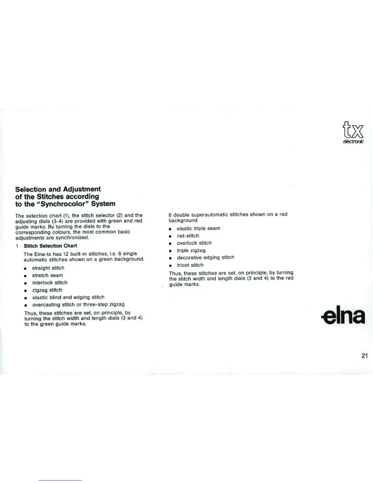 ELNA TX - Stitch Selection and Adjustment; Stitch Selection Chart