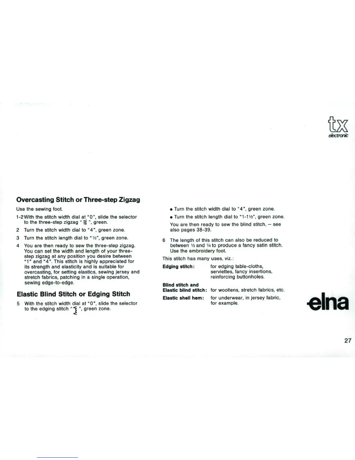 ELNA TX - Overcasting Stitch or Three-step Zigzag; Elastic Blind Stitch or Edging Stitch