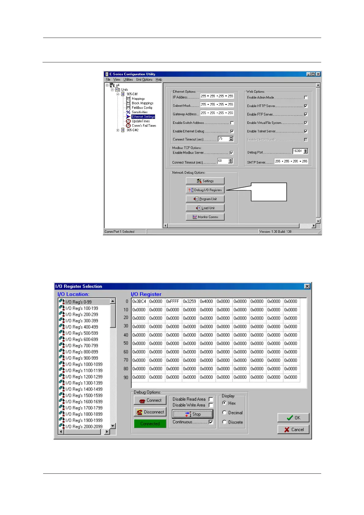 To debug the registers you will need to select ‘Connect’ under Debug Options. The Green /