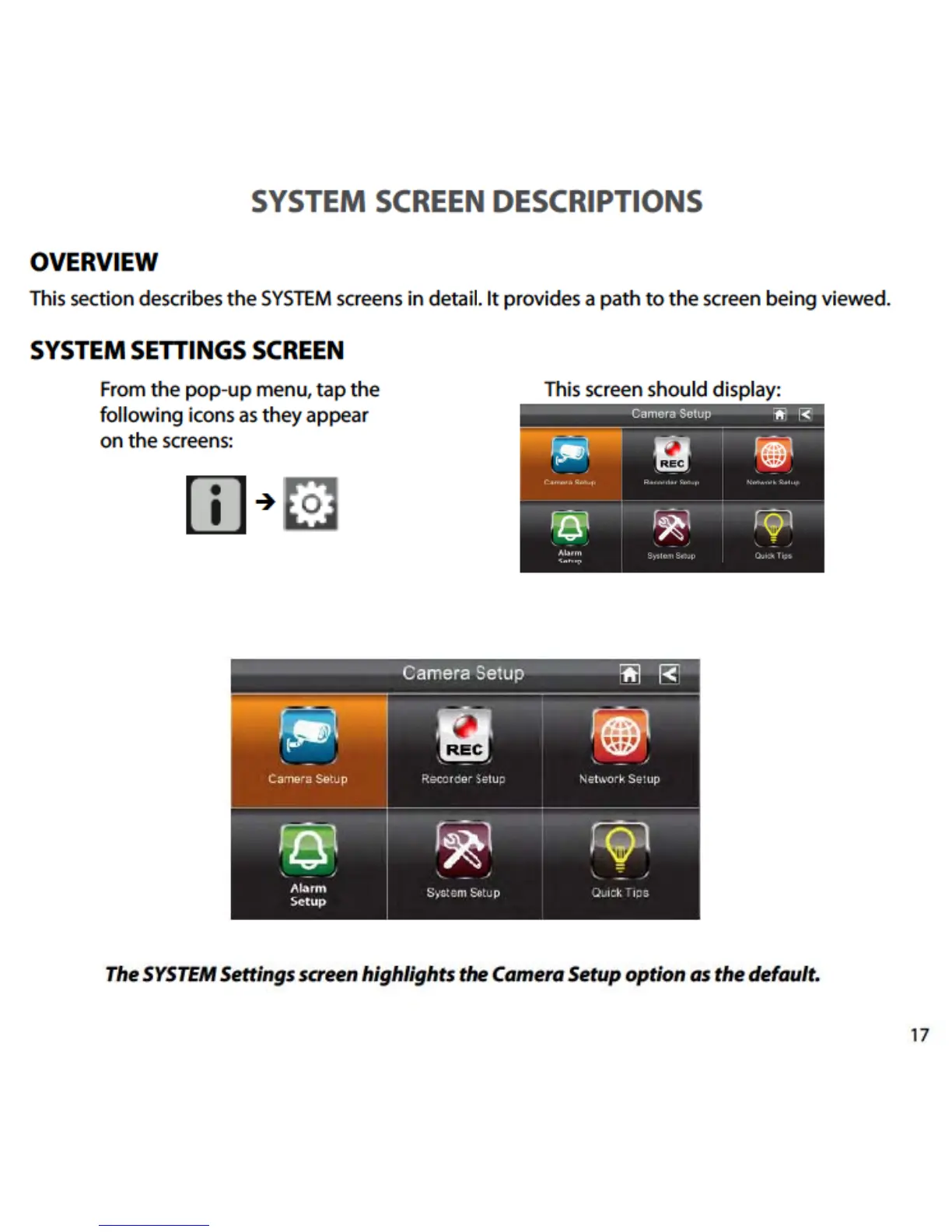 ELRO CS87T - SYSTEM SCREEN DESCRIPTIONS; SYSTEM SETTINGS SCREEN