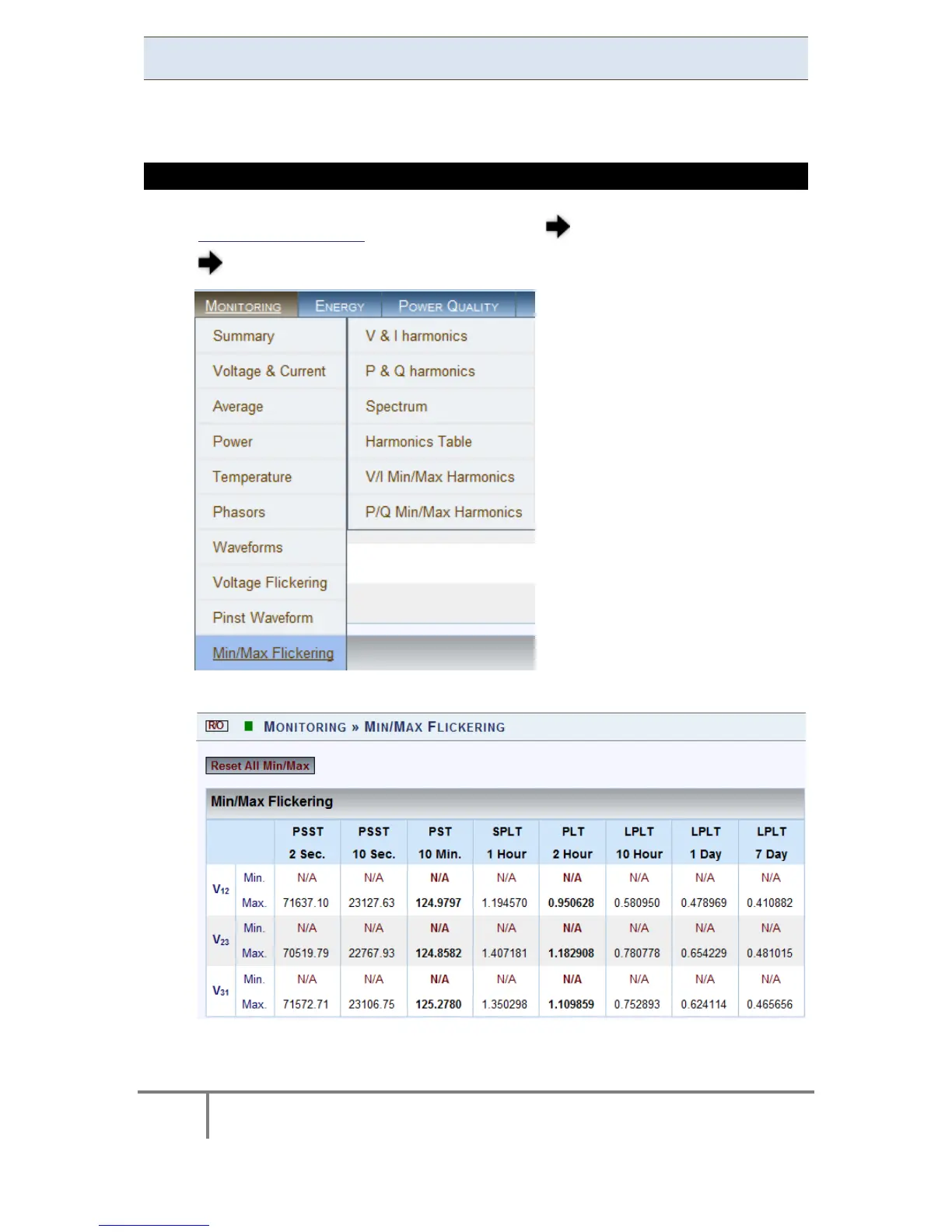 Displays the minimum & maximum short & long term Voltage Flickering vales to a