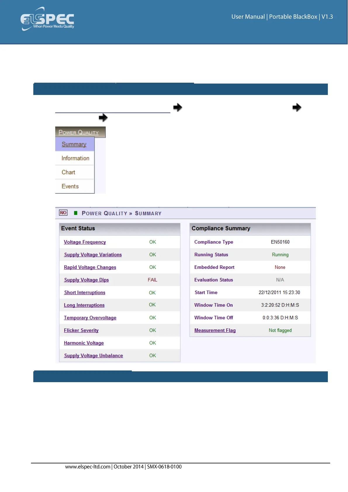 The Events Status Table shows a high level PASS or FAIL indication of each PQ parameter. Any PQ