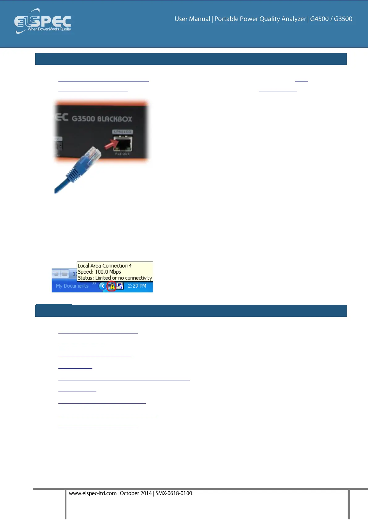 After you have switched on your G3500 Portable PQ Analyzer, connect the LAN