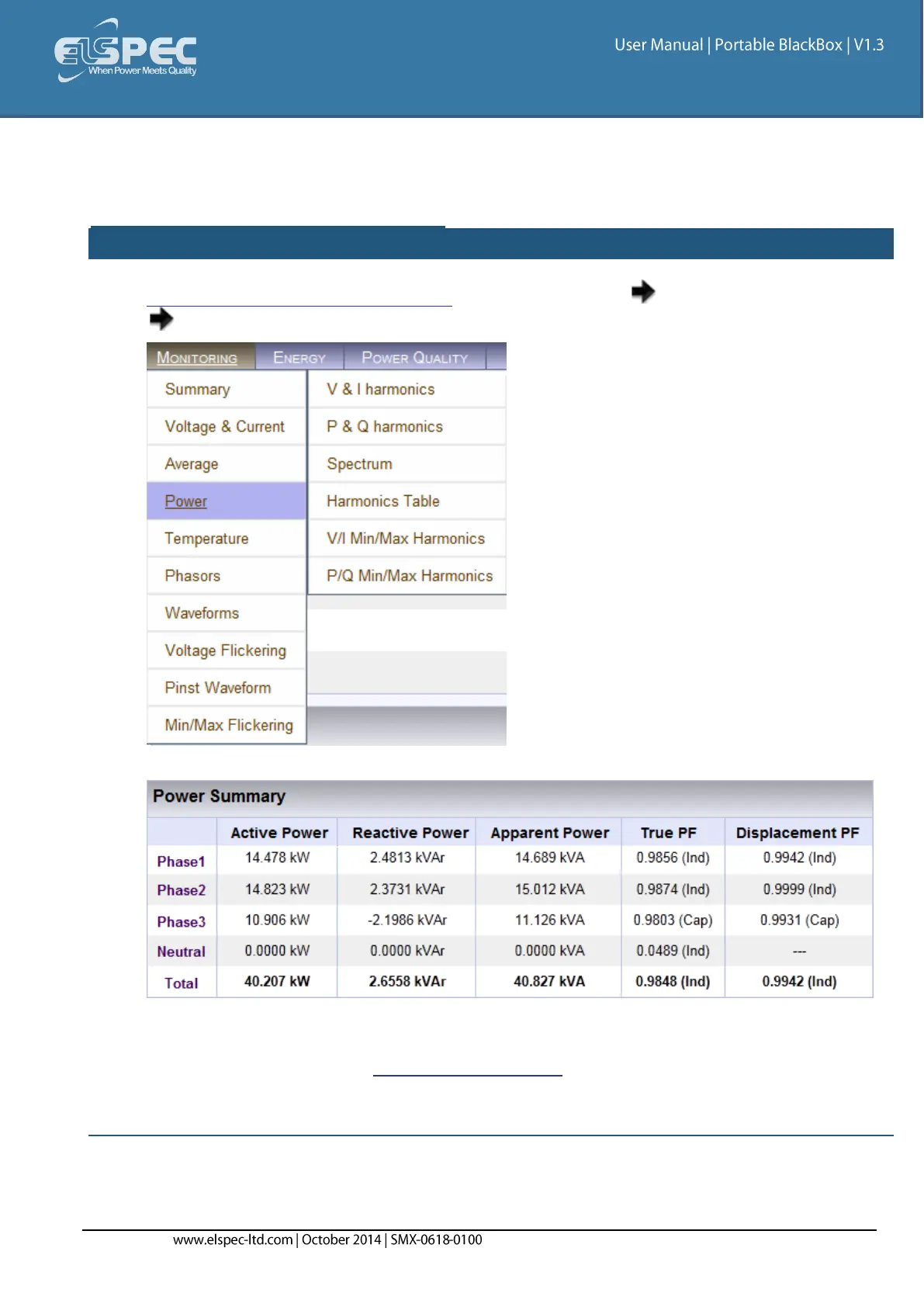 This page displays different electrical power parameters relevant to the Specific G4500/G3500