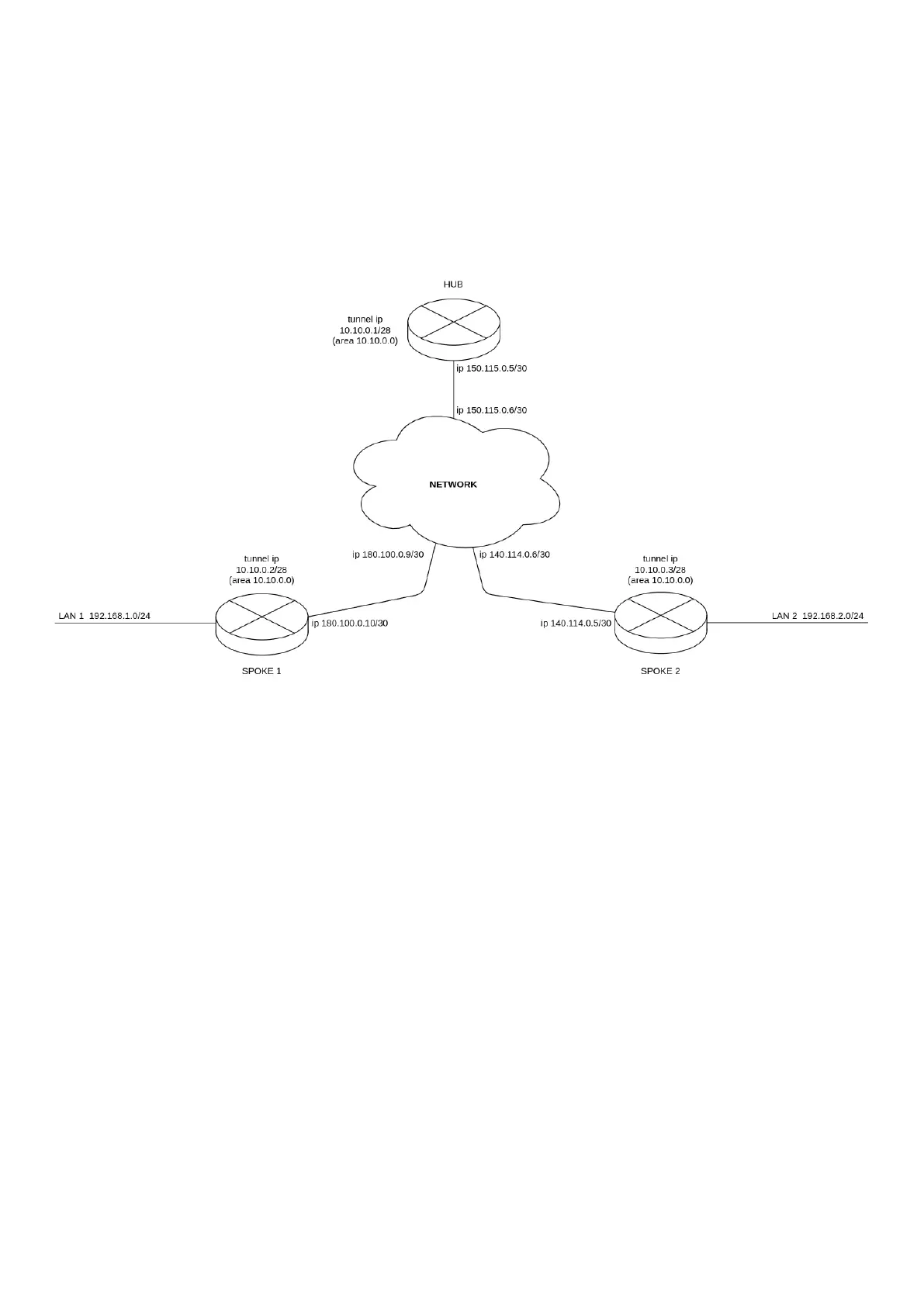 HUB router and two branches. The HUB is the DMVPN server (NHS), and the branches are DMVPN clients