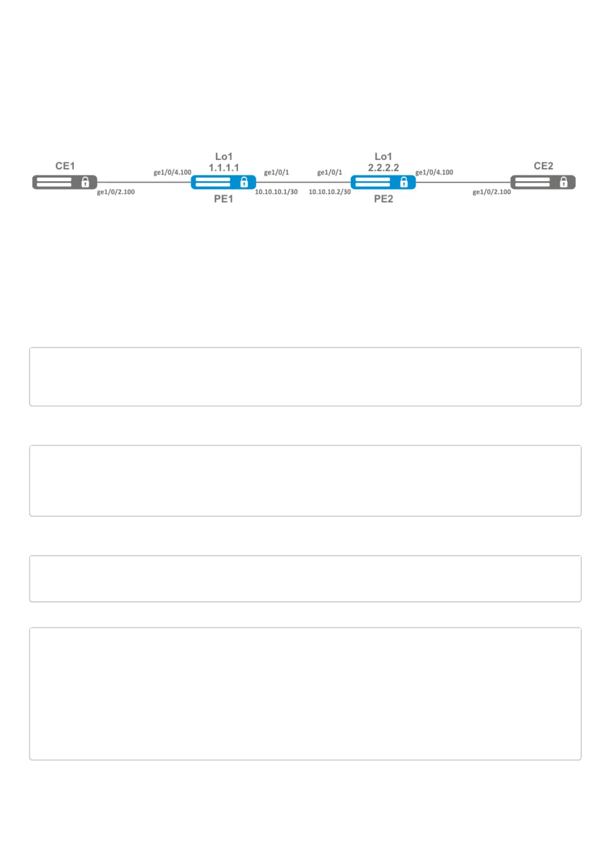 Configure l2vpn so that ge1/0/2.100 interface of the CE1 router and ge1/0/2.100 interface of the CE2 router