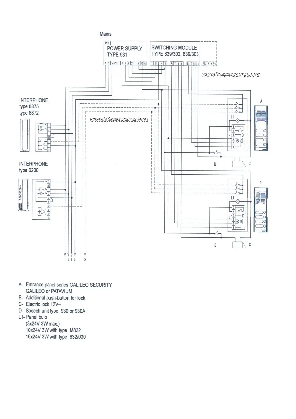 Elvox 6200 - Wiring Diagram: 2 Entrance System with 931 Power Supply
