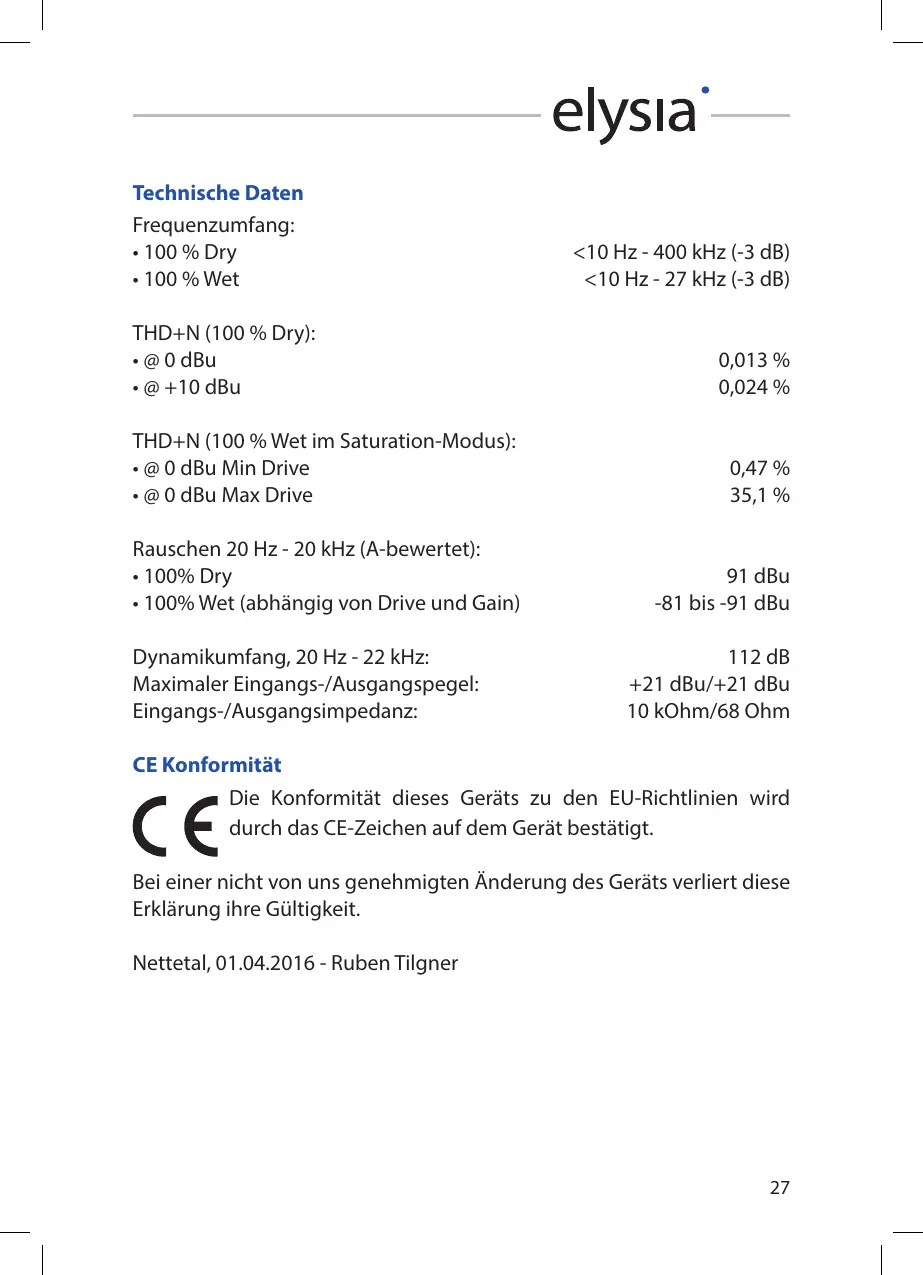• 100 % Wet <10 Hz - 27 kHz (-3 dB)