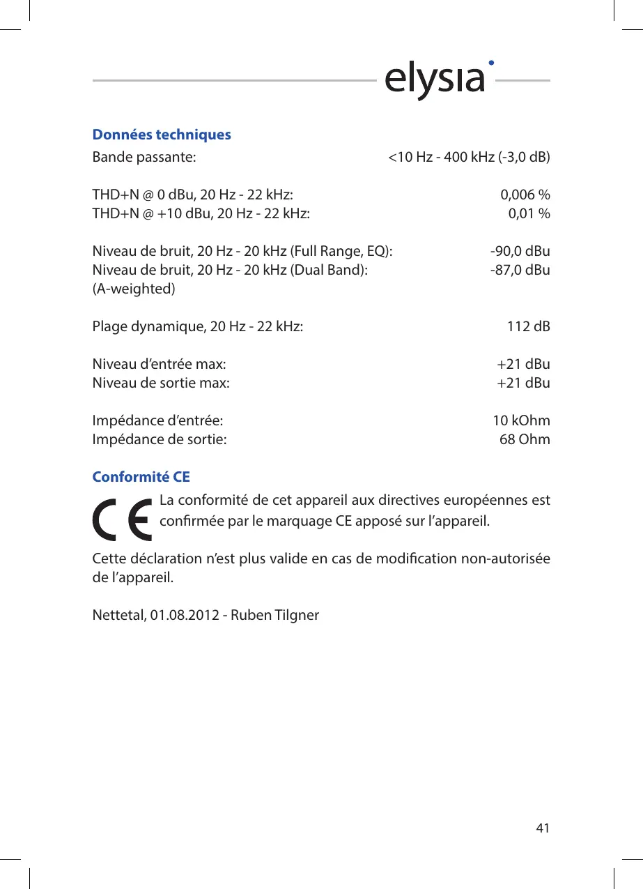 Plage dynamique, 20 Hz - 22 kHz: 112 dB