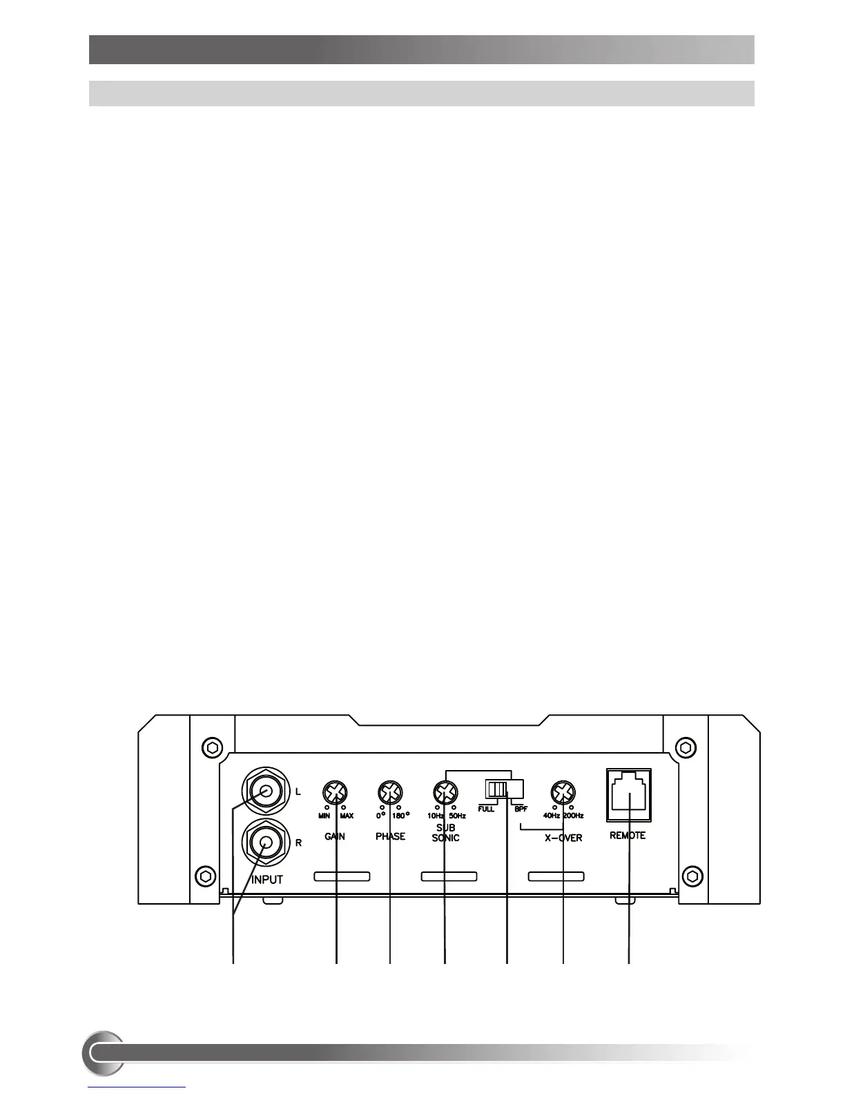 Inputgaincontrolpotentiometer,allowingtomatchtheoutputvoltageoftheheadunit’s