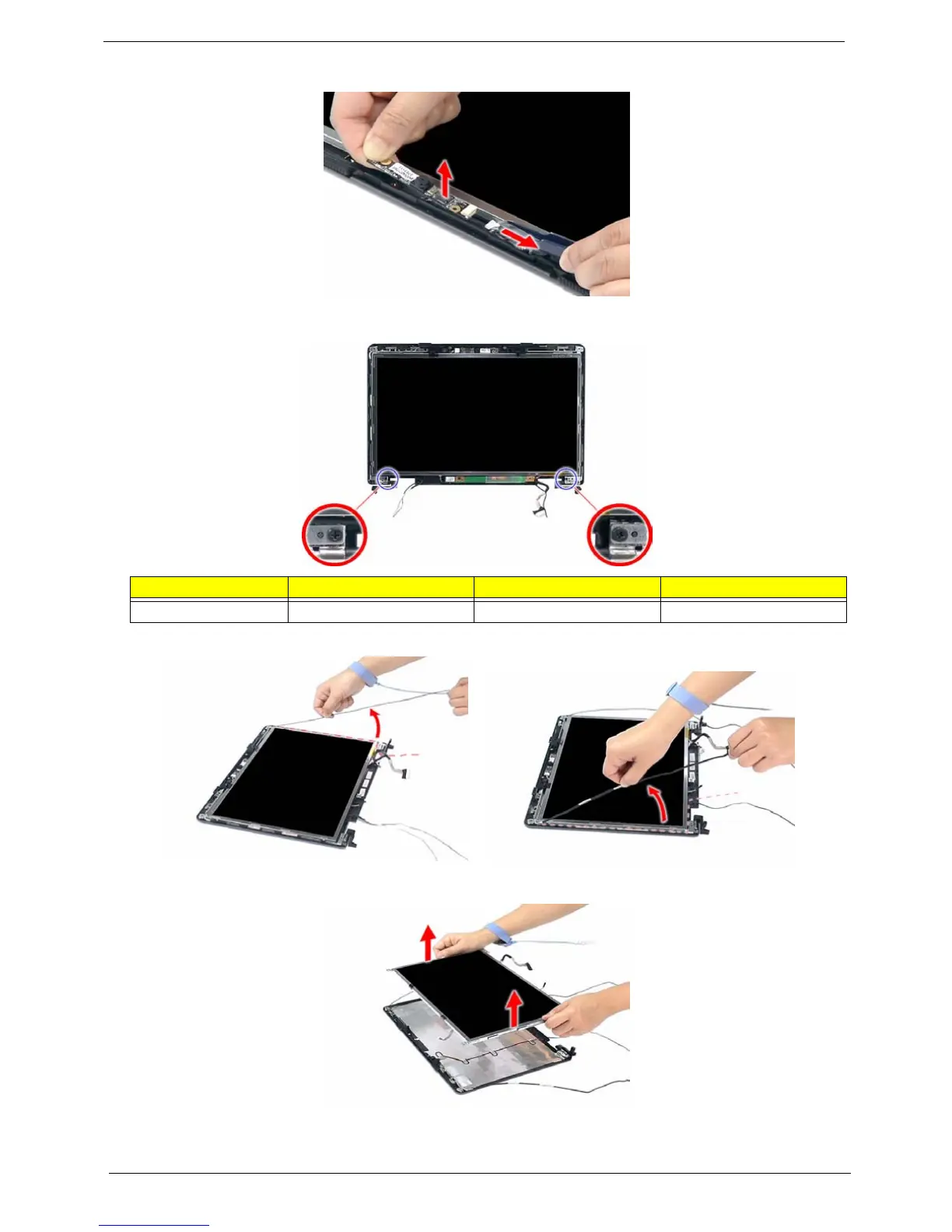 15. Carefully detach the cables from the latches on the LCD bracket as shown.