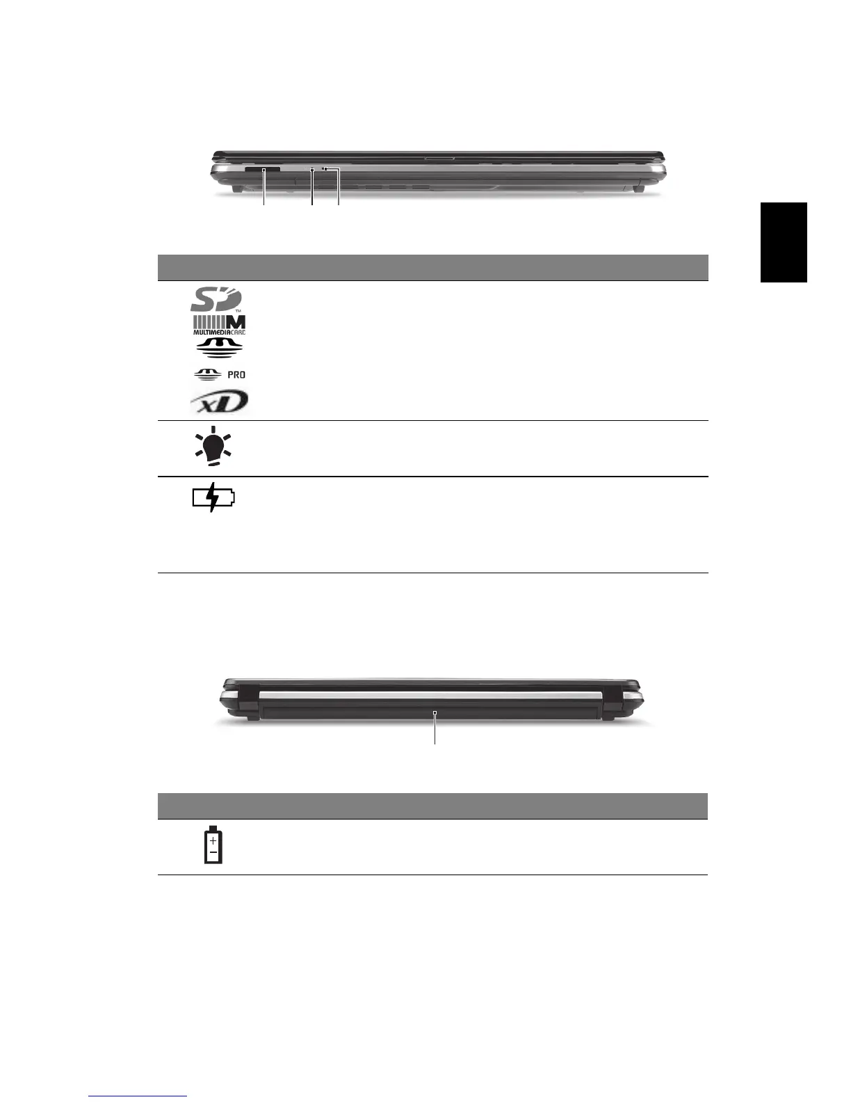 1. Frontpanelindikatorene er synlige selv når skjermen er lukket.